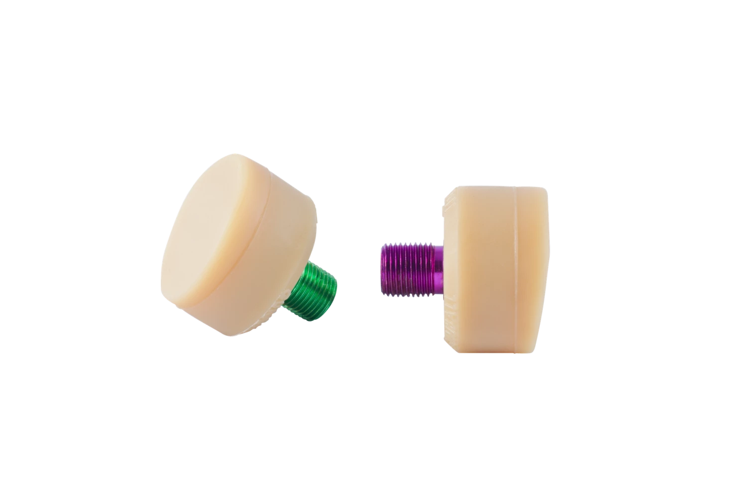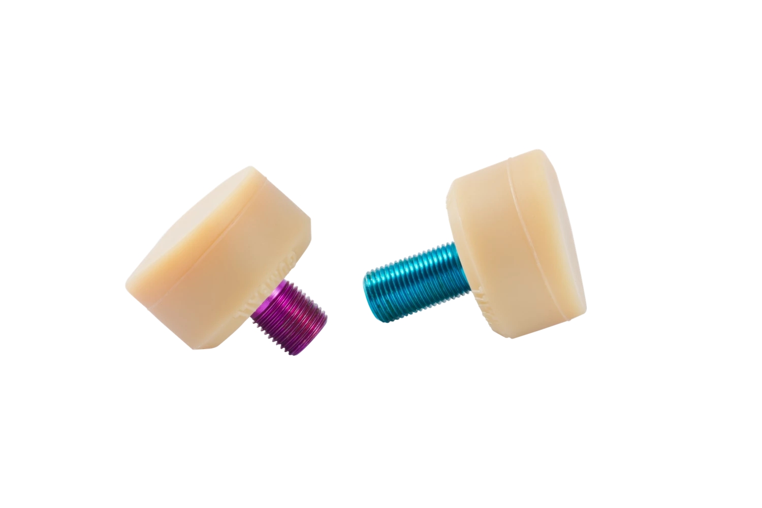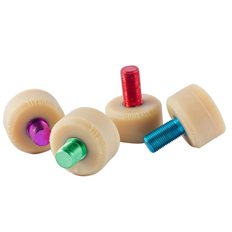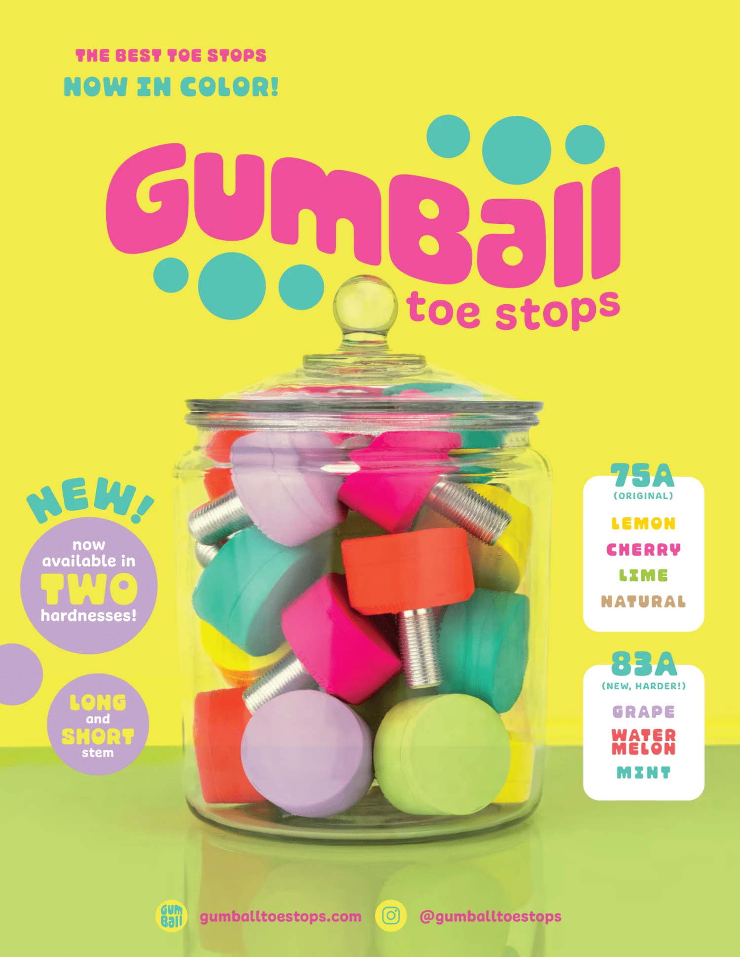 Gumball Toe Stops are made and designed specifically with roller derby in mind. Molded with an all natural rubber, these skate stoppers have the perfect balance of grip and durability. Gumballs are great for all surfaces; wood, sport tile, cement/concrete, masonite (banked track) and outdoor.