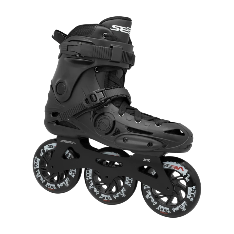 Seba E3 110 Premium in black is equipped with a 232mm aluminum frame with 3x 110mm / 85 A wheels and an Abec 9 ball bearing.