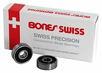 Bones Swiss bearings; the standard for over 24 years. Single non-contact, removable rubber shield, high speed nylon ball retainer, pre-lubricated with Speed Cream. The best-selling high-end skate bearing the US.Â